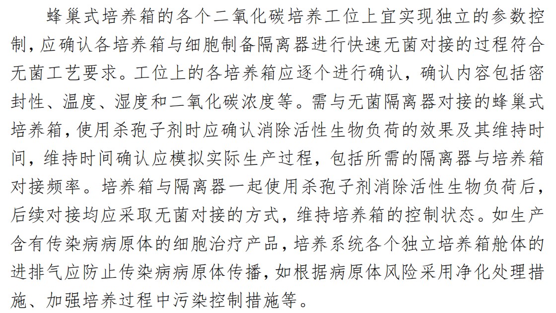 蜂巢培養(yǎng)箱是由蜂巢式多工位模塊和配套的培養(yǎng)箱組成,為細胞培養(yǎng)的常用設備,在《指南》中也有較詳細的闡述,主要包括設備構成與內(nèi)部環(huán)境要求、設備電源要求、氣源要求、參數(shù)和性能的確認等。