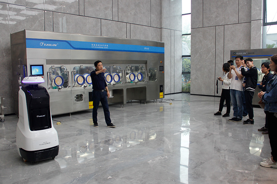 泰林生物副總經(jīng)理夏信群向各位領(lǐng)導(dǎo)、專家們介紹正在自動行走的滅菌機器人,以及應(yīng)用于CAR-T細(xì)胞治療的細(xì)胞治療工作站。